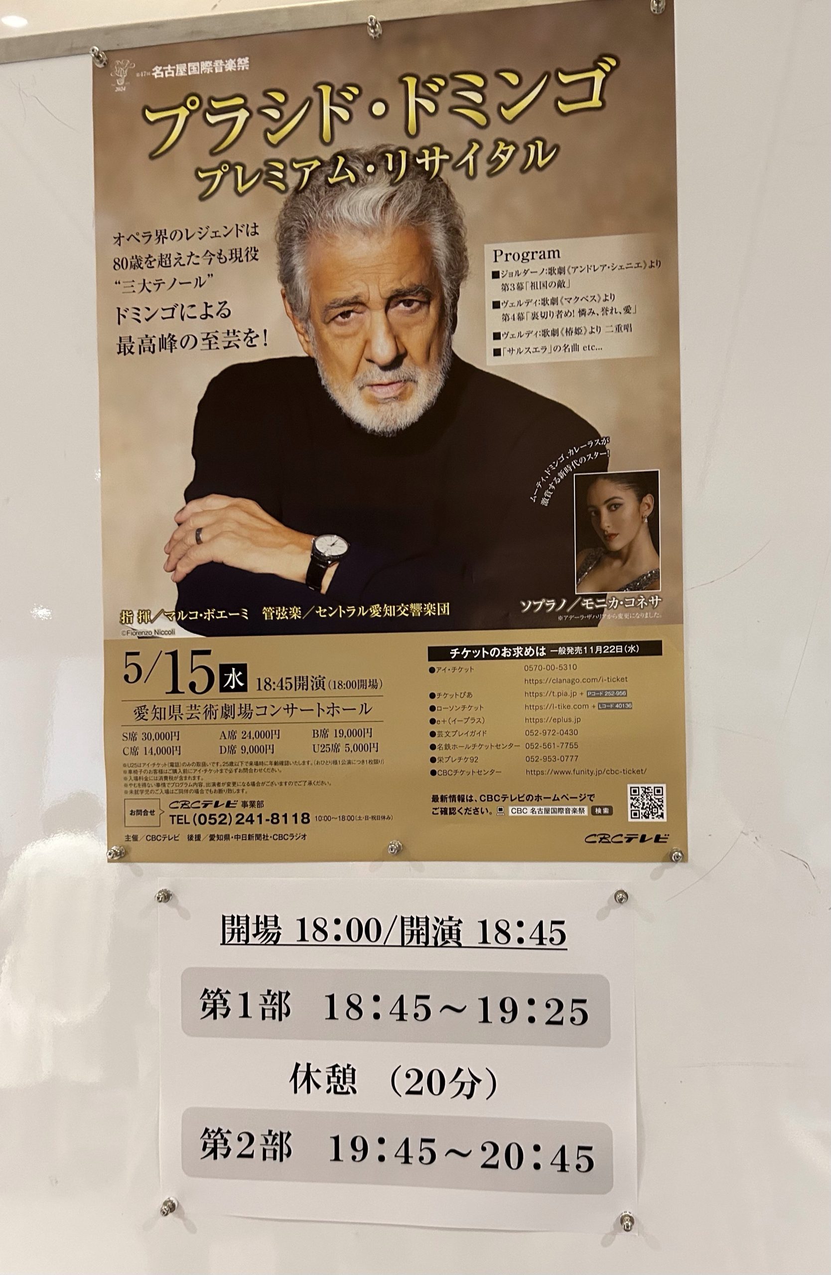 行って初めて知ったのですが、伴奏はセントラル愛知。指揮者のマルコ・ボエーミが凄いのかいつものセントラルとは違いました❗️人数もフルオケ100人規模、管楽器のキレがとても良く、抒情的な曲では木管楽器は身体を揺らして大きく表現して歌っています。題目が全てオペラからだったせいか、ソプラノのモニカ・コネサとドミンゴの登場人物2人のオペラを観ているかのようなステージでした。