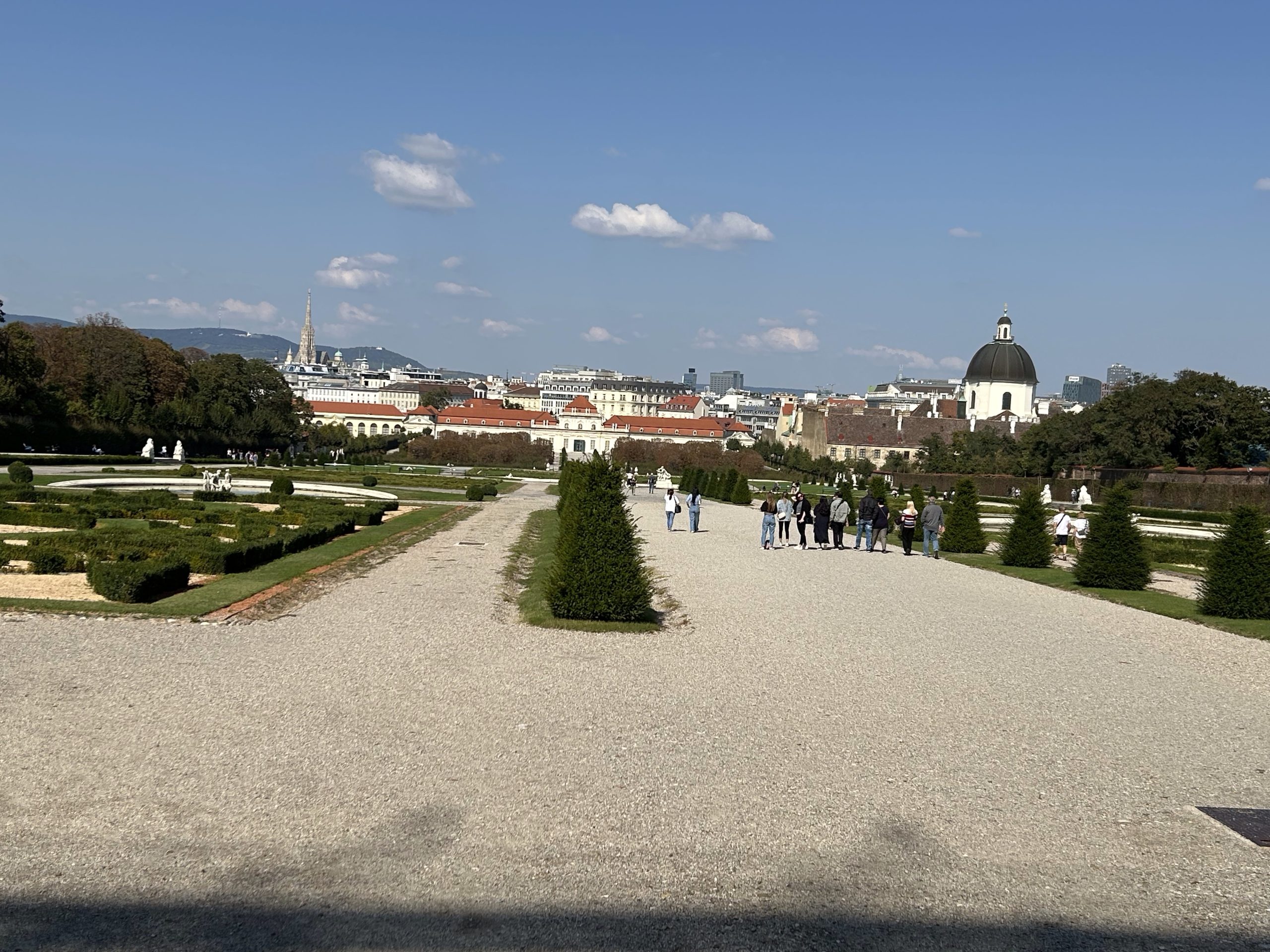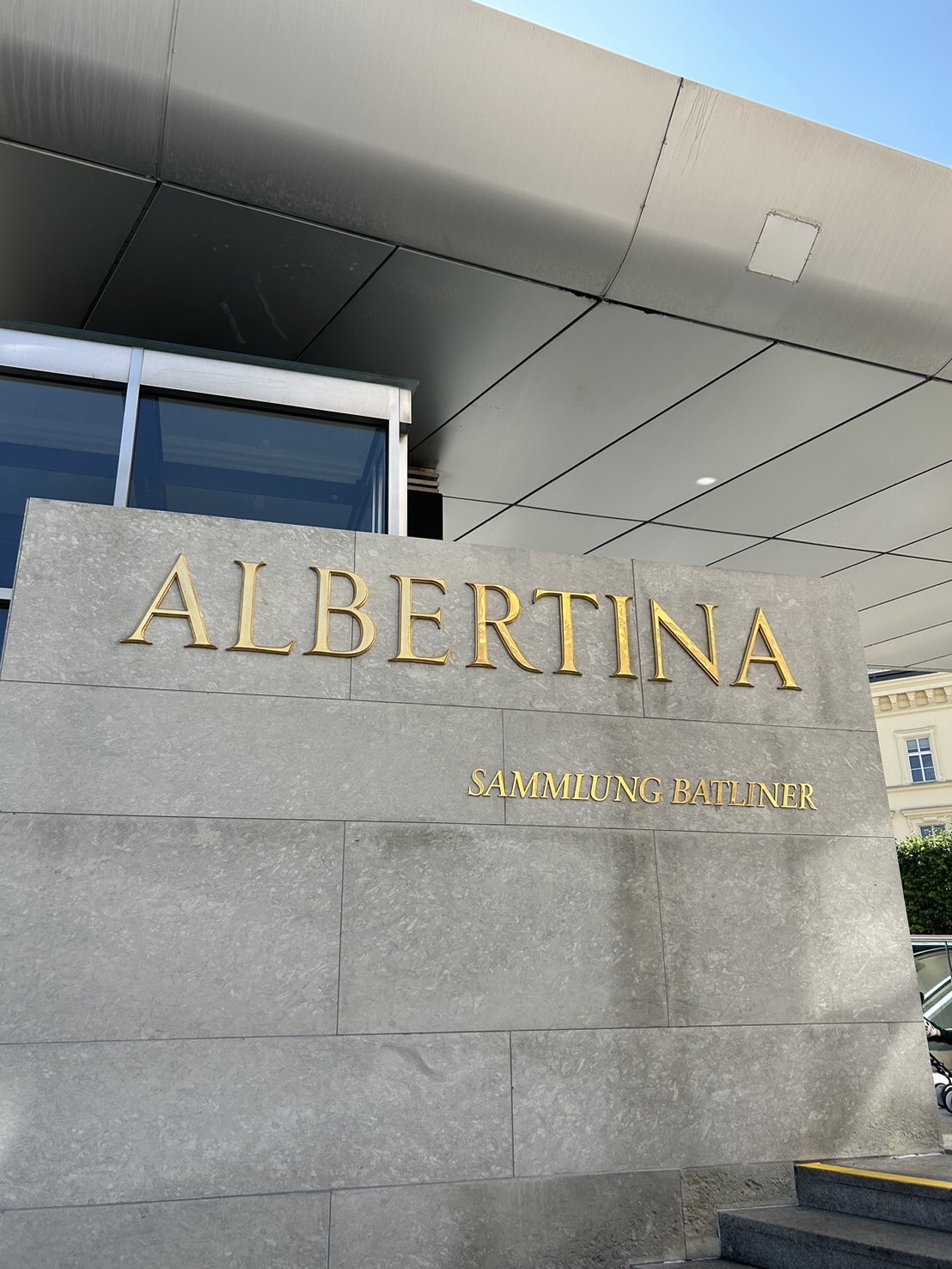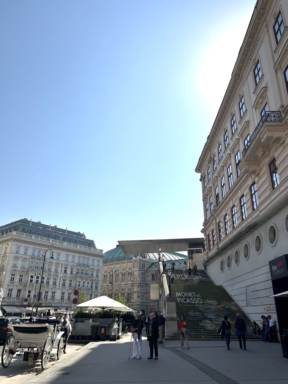 最も知られているのは「The Kiss 」(接吻)です。写真の色が悪いですが、実際にはキンキラ金です✨クリムト模様の四角いモザイク模様も見られます。「ユディット」も知られていますね。この絵も好きです❤️ベルヴェデーレにはいきなり行ってしまいましたが、予約が必要でした。今はなんでもオンラインで予約やチケット購入が可能なので、次回からは気をつけたいと思いました。時間まで1時間弱あったので、向かいのレストランでランチしたり少しお庭を見ました。(この日は空いていて良かったです😄)中央の緑色の屋根の建物はオペラ座です(裏側)✨ 左側の白い建物はオペラ座裏のホテルザッハー(写真は正面ではなく西側)。この1階(西側)がまさにカフェ・モーツァルトとなっています。ホテルザッハーの正面にはザッハートルテで有名なカフェ・ザッハーがあります。この場所はフィアカー(馬車)乗り場ともなっていて賑わっています。王宮の一画にあるアルベルティーナ美術館は特別展で「モネとピカソ展」をやっていたので見ました!