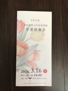 だいぶ更新が遅れてしまいましたが、3月には愛知教育大学音楽専修の卒業演奏会に行ってきました。このコンサートは卒業試験で上位成績優秀者が演奏することができます。